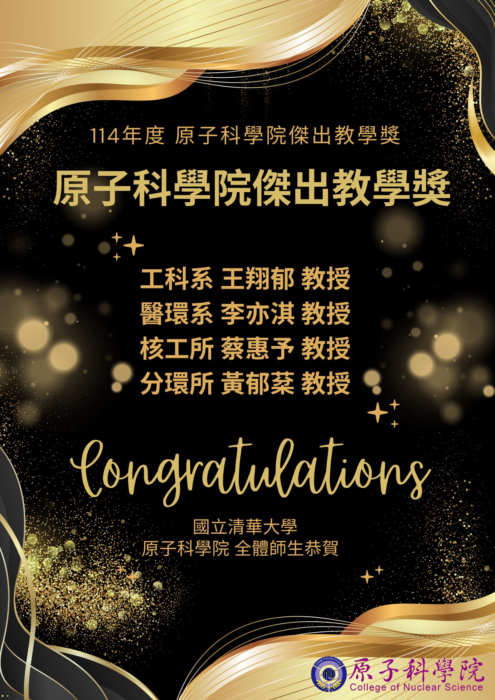 【恭賀】恭賀原子科學院114學年度傑出教學獎_工科系王翔郁教授、醫環系李亦淇教授、核工所蔡惠予教授、分環所黃郁棻教授